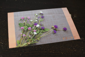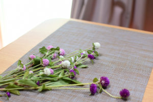 採取した千日紅を陽の当たる机のランチョンマットの上に並べます。