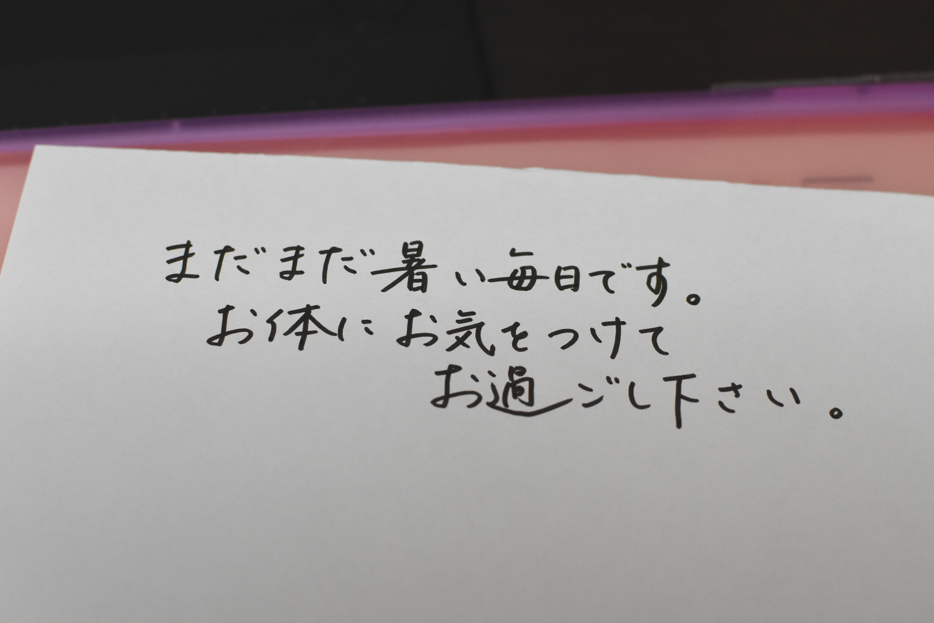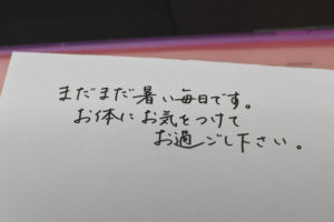 このメッセージは月ごとに違っていて季節にあった文章を社員さんにペンで書いてもらい、それを用いて作成しています。